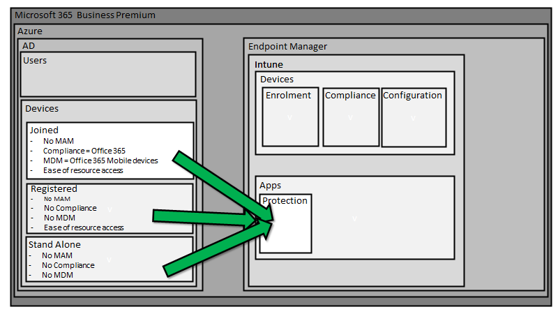 MAM allows the ability to fully manage select applications, typically business applications like Outlook Mobile, Word Mobile, etc on any device. MAM is handy because it doesn’t require device management (MDM). This makes especially handy when users bring their own personal devices and want access to business data like emails but don’t want the organisation having fully control of their device. Thus, MAM is prefect for the Bring Your Own Device (BYOD) scenario.