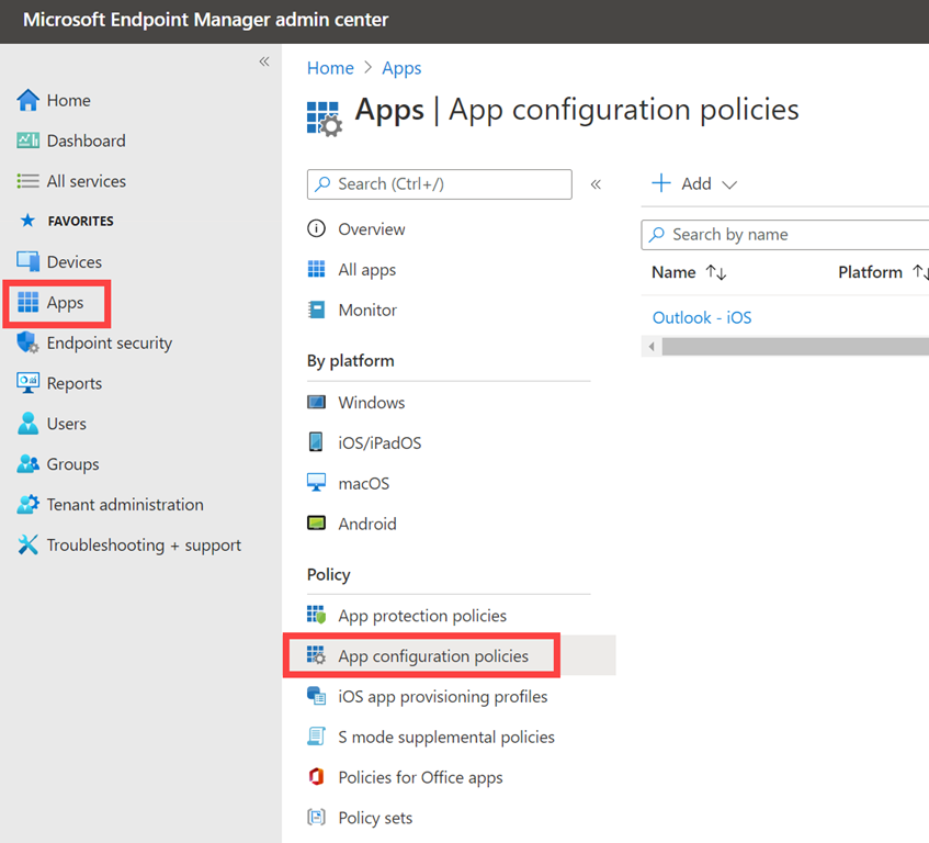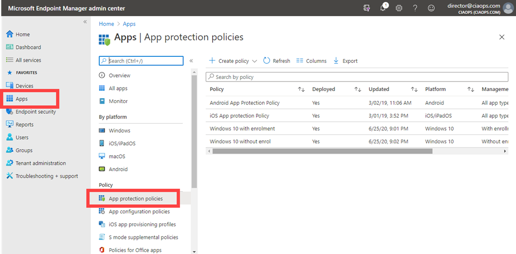 These policies are located in the Endpoint Manager portal under Apps and then App protection policies as shown above.