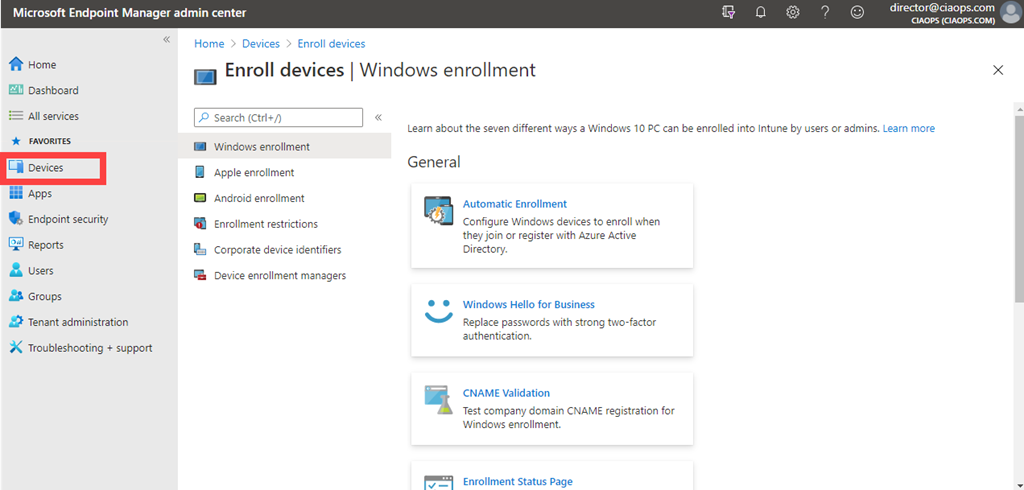 and then go to the Devices option from the menu on the left then Enroll devices as shown above.