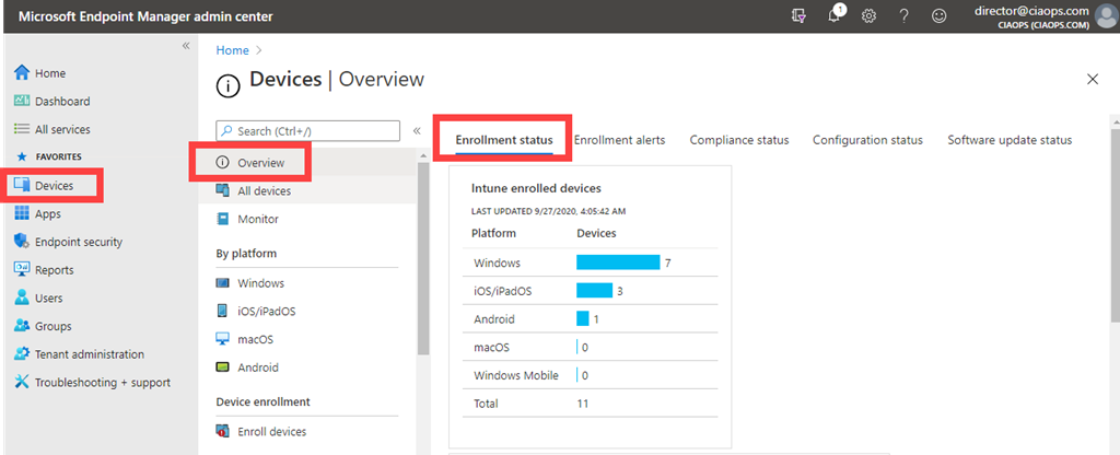 You can get an overview of the device enrolment status in your environment (i.e. successes and failures) via Endpoint Manager | Devices | Overview | Enrollment status as shown above. You’ll also see any Enrollment alerts on the very next tab to the right.