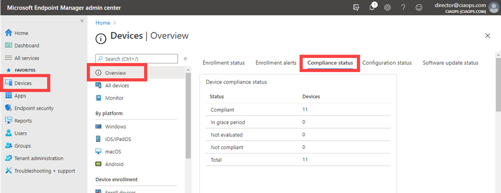 You can get an overview of the device compliance status in your environment by navigating to Endpoint Manager | Devices | Overview | Compliance status as shown above.