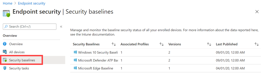 Next, if you go and look in Microsoft EndPoint Manager you will see a growing number of similar baseline policies. I say growing, because a