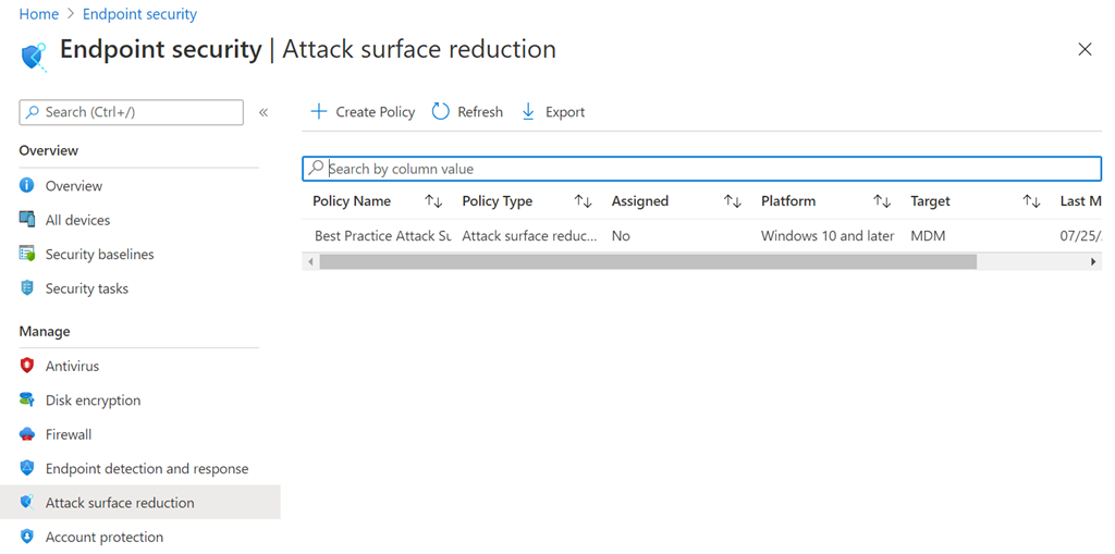 If look inside any of these Endpoint option, here Attack surface reduction, you see that you can set policies just like what has already been covered around Intune device and application policies.