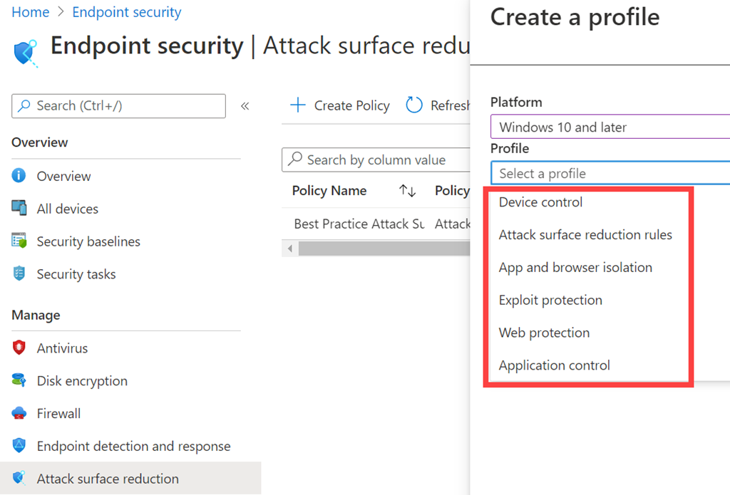 When you do create an Attack surface reduction policy, for example, you’ll get the option to target device control, attack surface reduction rules, app and browser isolation and so on, as shown above.
