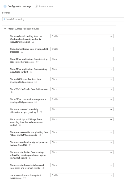 If you configure the attack surface reduction rules, as shown above, you’ll see the now familiar configuration settings that you choose from and then save to the policy. You then finally target the policy that you create to a user and/or a device, again just like Intune.