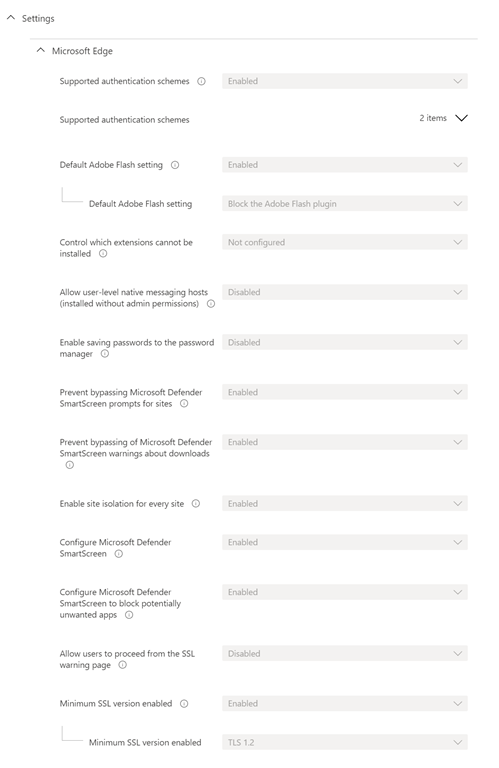 When you look at the settings available in these baselines, as shown above for Edge, you’ll notice that they basically contain many of the same settings available to you in individual Endpoint security policies. Thus, setting once via a baseline ‘profile’ is a much faster method of implement these settings. Otherwise, you’d probably have to create multiple individual policies to achieve the same level of protection.