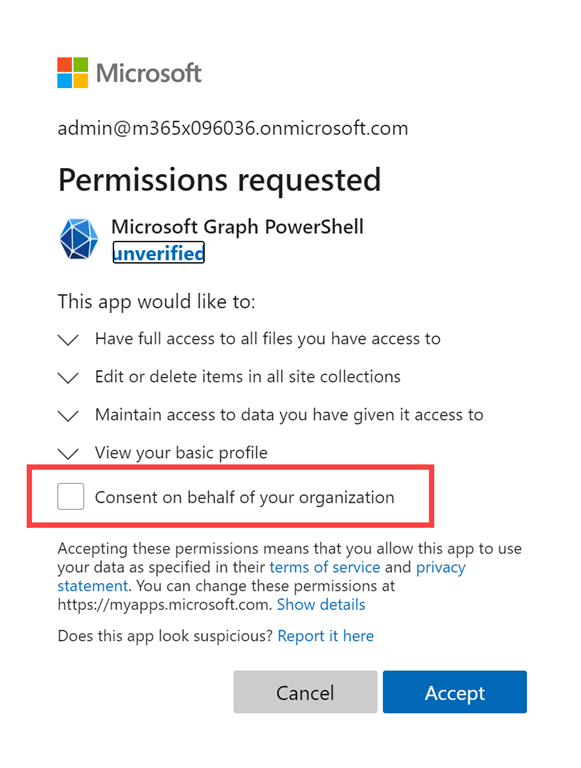 During the connection process you’ll be asked to consent to the permissions just requested, as shown above. If you simply select Accept here, you are just consenting for the current user. However, if you check the Consent in behalf of your organization option you’ll be providing these permissions to ALL users in your tenant! For now, only consent will be granted for the current user. However, be very, very careful consenting for the whole organization as I will illustrate.