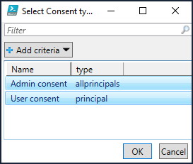 You’ll then be prompted to select whether you wish to select Admin consent and/or User Consent permissions. You can select both here if you wish by using the CTRL and/or SHIFT key when making selections (i.e. just like when you use Windows Explorer).