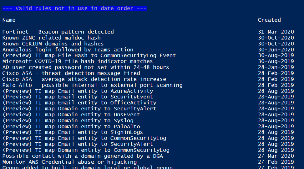 The last listing in script will show you all the rules that are NOT in use in date order. This is handy as I don’t see anything like this in the web portal.