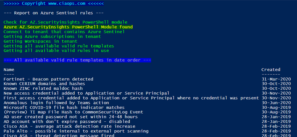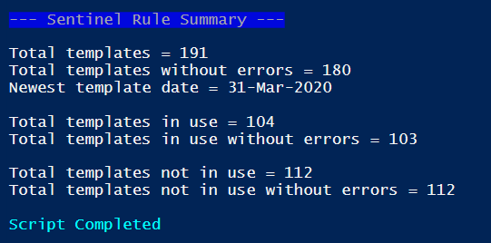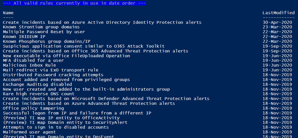 The script will now display a list of all the available Rule Templates in Sentinel as shown above, sorted by most recently added (handy to see what’s new!).