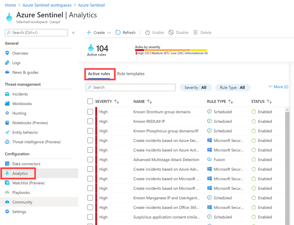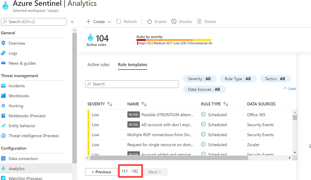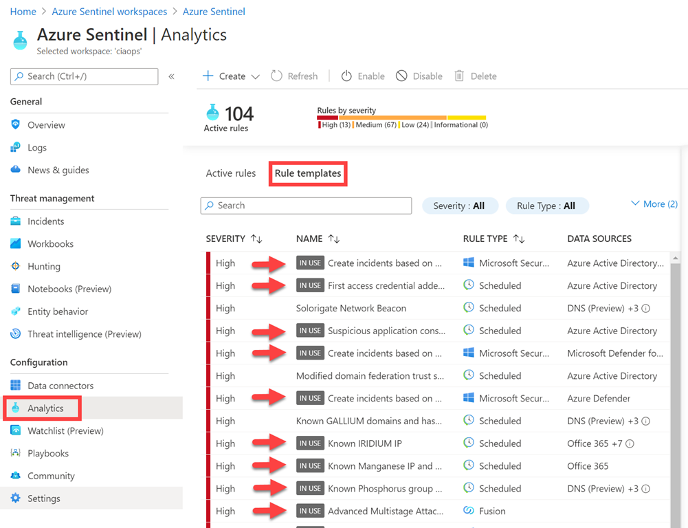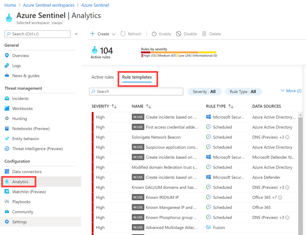 This list is what you see in the Azure Sentinel portal when you select Analytics, then Rule templates as shown above. In effect, this is every analytics rule Sentinel makes available to you.
