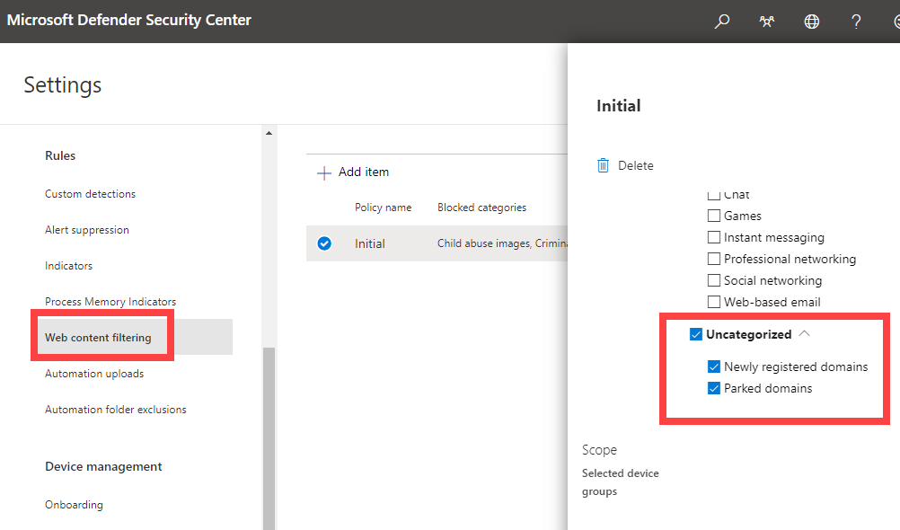 To set this, navigate to Settings, the under Rules select Web content filtering and create or adjust a policy to include all the Uncategorized options as shown above.