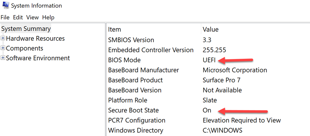 Here you should find both the BIOS mode set to UEFI and the Secure Boot State set to ON.