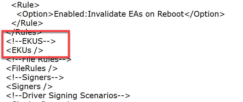 If you look at another, more complete, WDAC policy, you’ll see that the EKU block is populated as shown above. The block reads like: