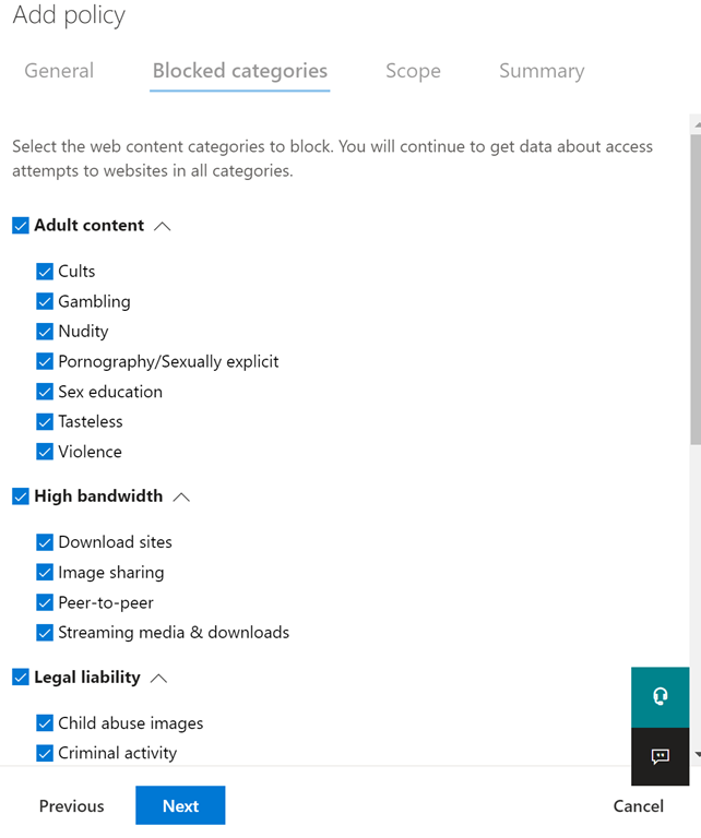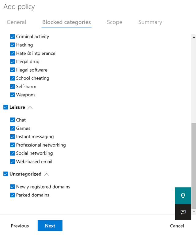 The limits of this approach are that you can only use the categories that have been provided (i.e. Adult content, High bandwidth, Legal liability, Leisure and Uncategorized). An interesting omission, in my opinion, is the ability to block social networking (i.e. Twitter, Facebook, etc).