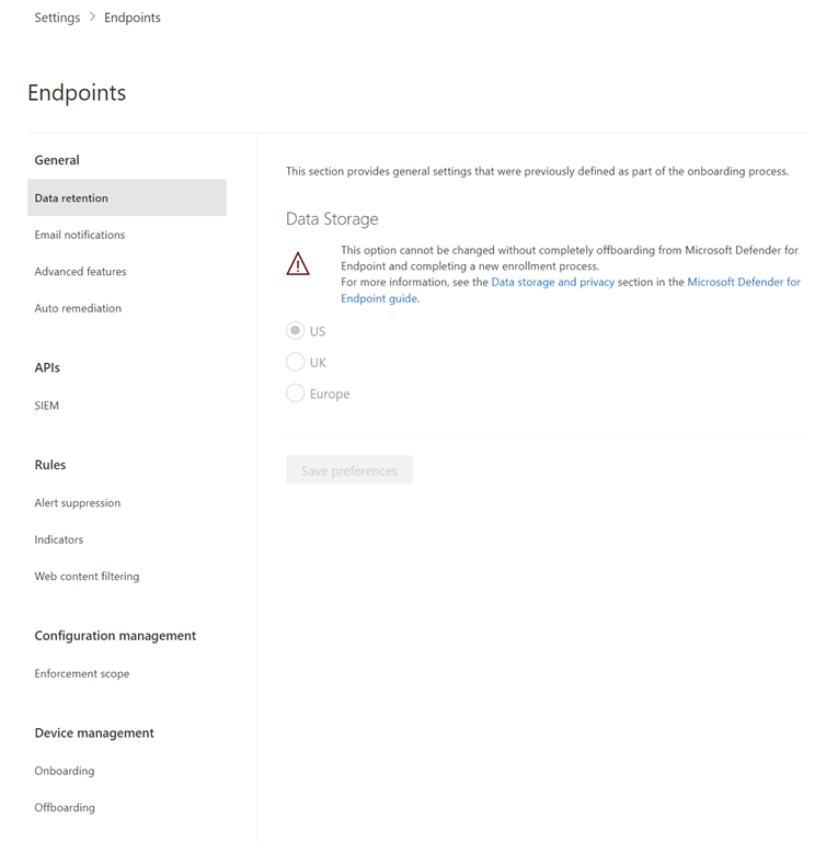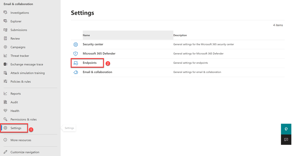 You’ll first need to ensure that custom network indicators have been enabled in your environment. You do this by navigating to https://security.microsoft.com, scroll down the list on.the left hand side until you locate Settings, then select Endpoints.