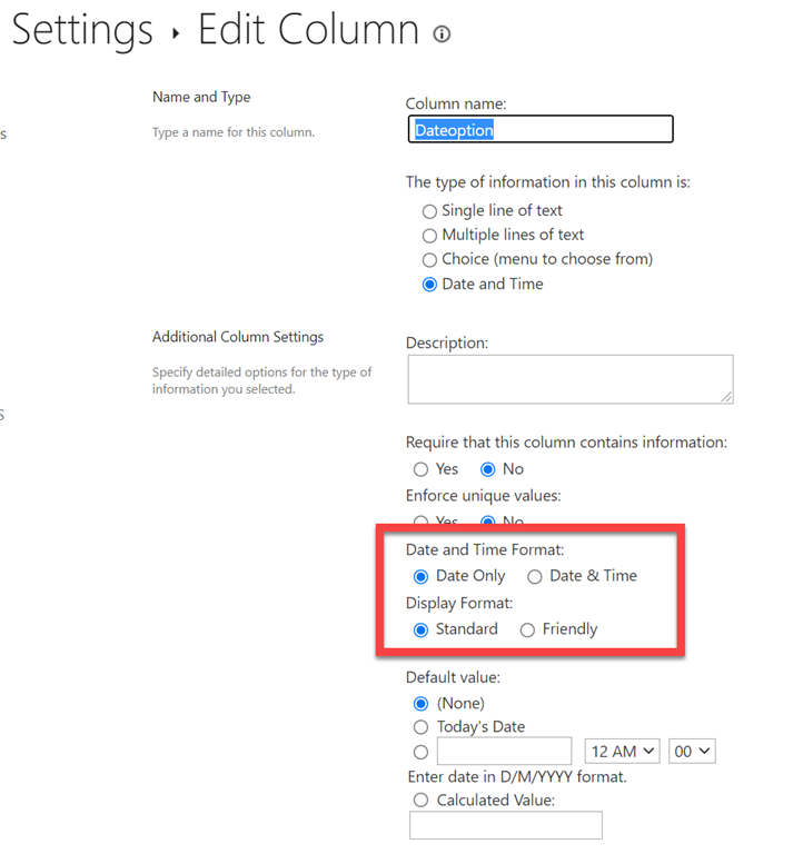 For simplicity, I have also configured my date column in the SharePoint list to exclude time and display in standard format as shown above. There is nothing stopping you using Date & Time if you wish, it just makes the filtering a little more complex later in this process.