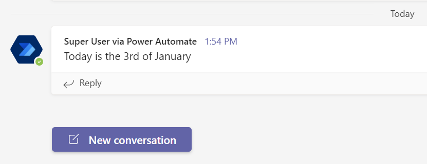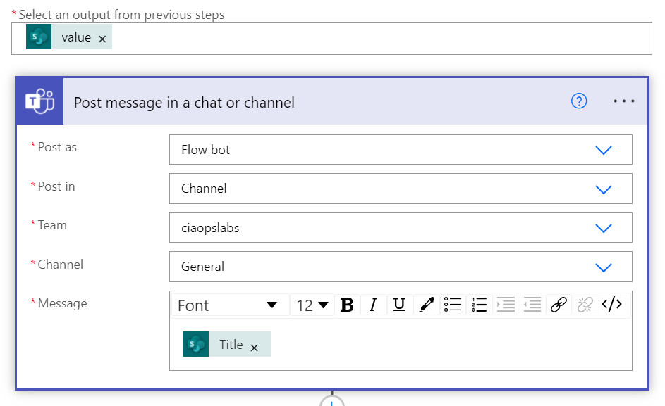 In the case of this example, I’m simply going to post the text from the Title field in the SharePoint list that matches today’s date into a chat message as shown above. Again, this action could be anything you want, in fact, I’ll talk about how I use this with Twitter later on. For now the expectation is that if there is a match in the SharePoint list for today’s date, then the text for that entry will appear in a Teams chat message.