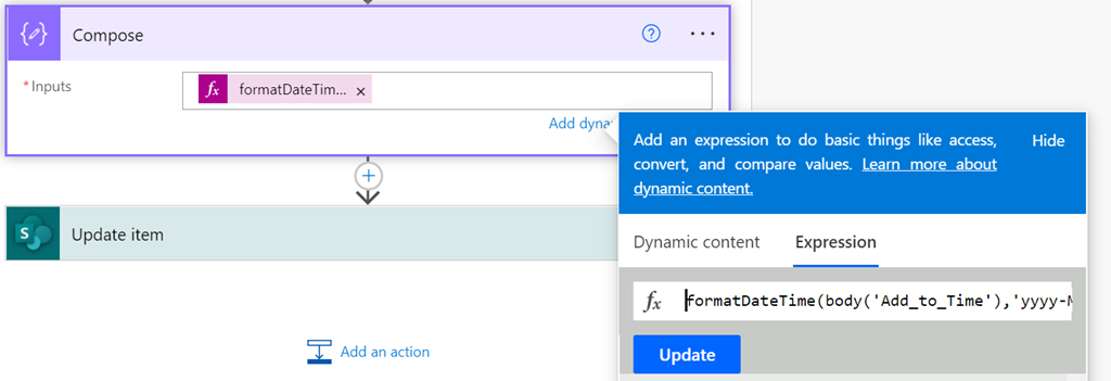 Before the new date can be added back to the SharePoint list it needs to be formatted correctly. This is achieved using the Compose action as shown using the following expression: