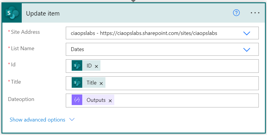 All that remains is to use the Update item action to update the item in the SharePoint list with the new date entry just composed. As shown above, the same SharePoint site and list is selected, along with the item ID and Title but the Dateoption field is set to contain our new formatted date output from the previous action.