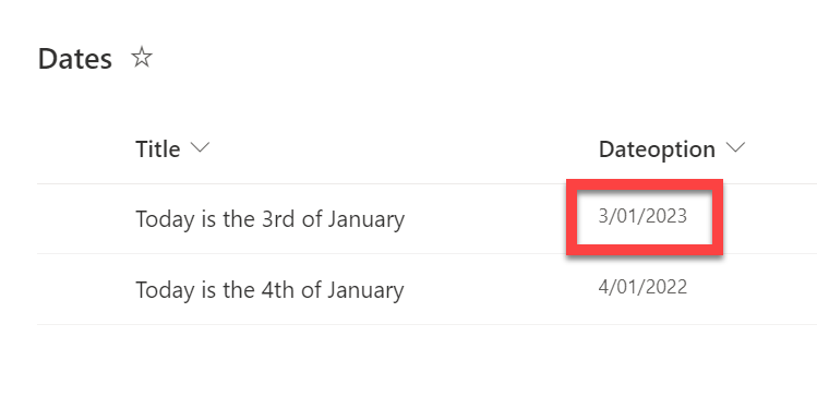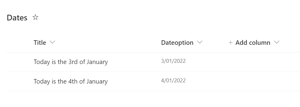 The starting point for this process is to create a reference list containing the dates and details you wish to share. I recommend that easiest place to do this is in a SharePoint list, as shown above. Of course, this list can contain as much detail and additional columns as you wish, but for this, I’ll keep it simple and just have two fields. It is important that you have at least one column (here Dateoption) that refers to the current year in which that item will be displayed.