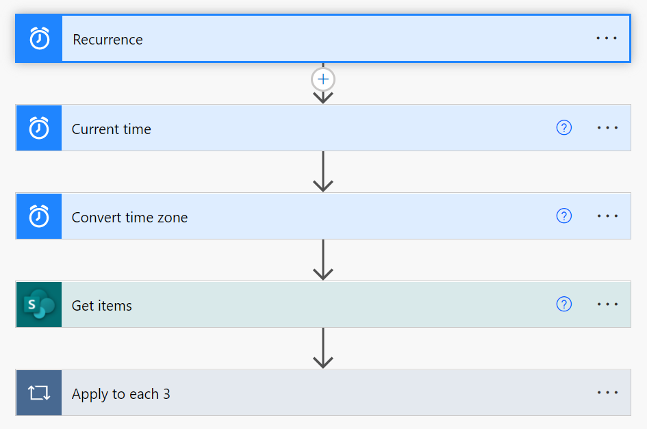 It all starts with a Recurrence action that will trigger this process once a day like so: