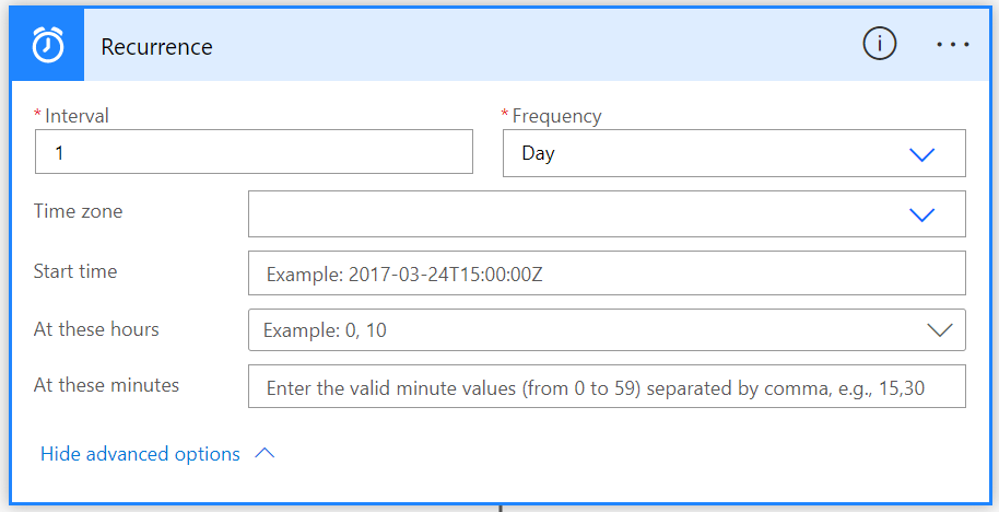 You can set an exact time when this Recurrence action will be triggered (say 10am). However, since this example is a daily anniversary, we only need to trigger it at any time during the day.