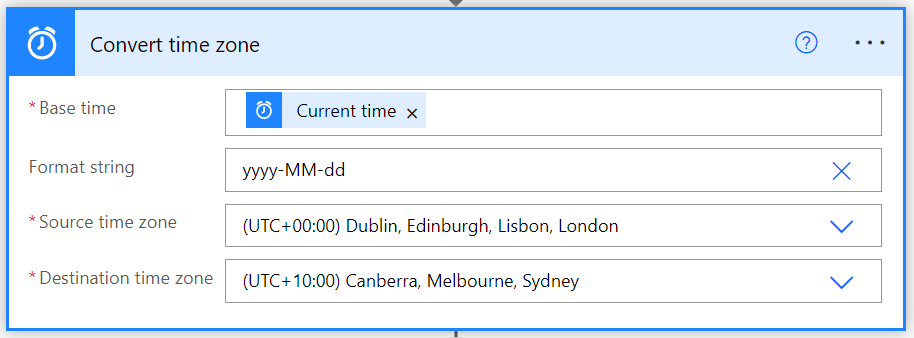 Next, add the Convert time zone action. There are two reasons for adding this action. Firstly, the Current time action returns today’s date in UTC which may cause issues if you are not in that time zone like me. Thus, I want the current time BUT I want it as a local value (i.e. to reflect the actual time in Sydney, Australia), thus the Source and Destination time zone field settings.