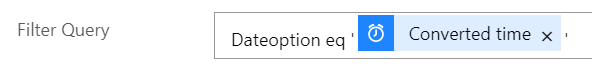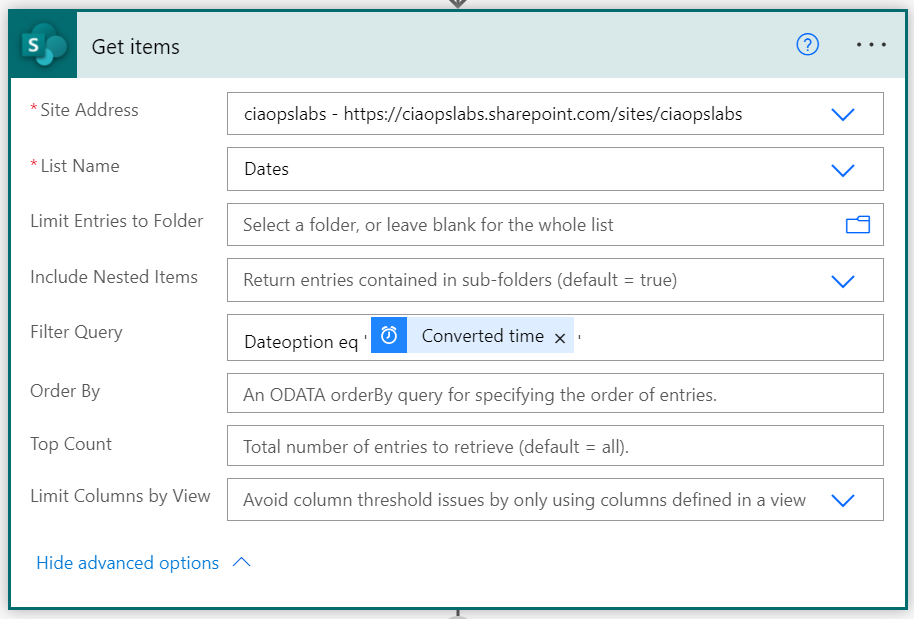 The Filter Query field will limit the items returned by this action to only those that match the filter. Thus, I want the returned items to only be those that match today’s date, which I have correctly formatted and stored in the Converted time action result. Thus, I want to compare the date field from my SharePoint list (here Dateoption) to the Converted time result. It is important to note that I have enclosed Converted time result in single quotes (‘) to convert the value to a string for comparison. It is very important that you do that, otherwise you’ll get errors when your Flow runs.