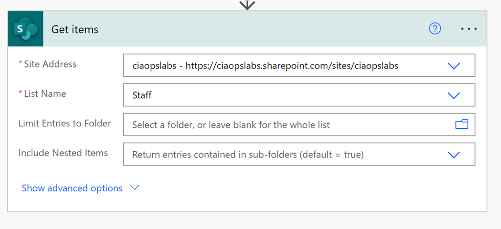 Add the Get items action as shown above next. Configure this action to retrieve from the list of users from the SharePoint list just created.