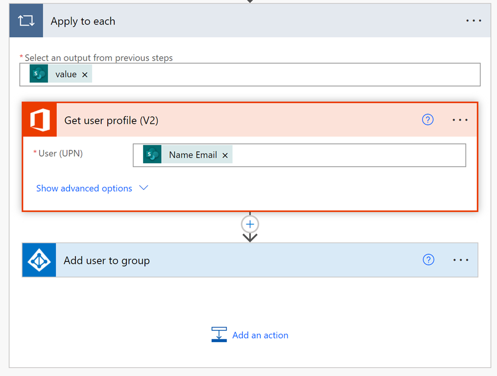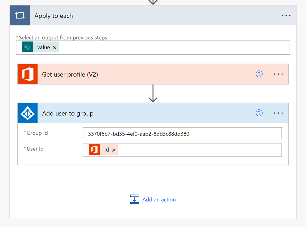 Also inside the Apply to each action add the Add user to group action as shown above. Populate this action with the ObjectID of the Azure AD security group obtained at the start and the Id from the Get user profile (V2) action.