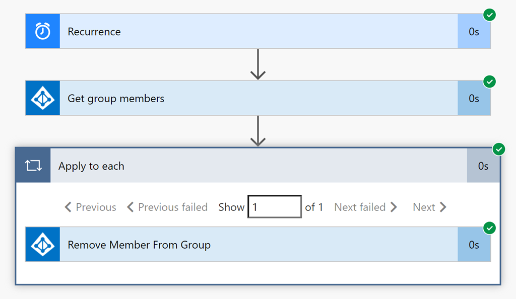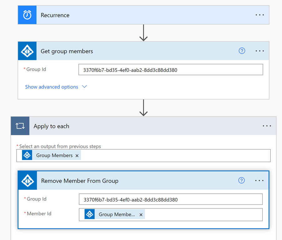 To allow access again for users simply create another scheduled Flow executing at say 6am that uses the Get group members action and then a Remove Member from group action inside an Apply to each action as shown above. In essence, this removes all users from the Azure AD security group that is part of the blocking Conditional Access policy, resulting in those users no longer being blocked from accessing the tenant.