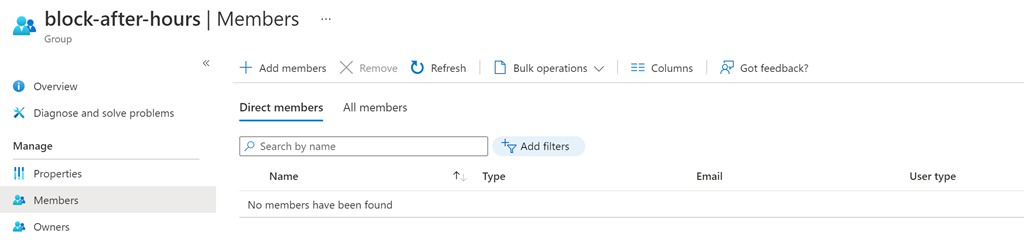 With no members in this Azure AD Security group, no one will be restricted from accessing the tenant.