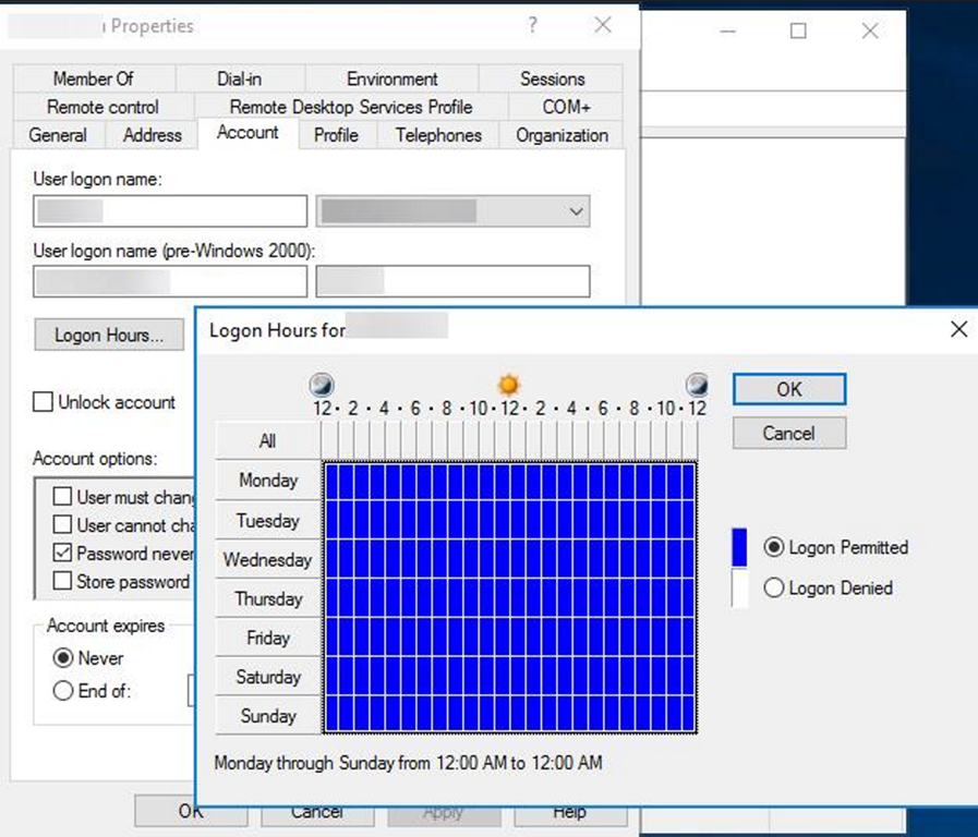 If you ever used an on premises Active Directory (AD) you may be aware of the setting, shown above, that allows you to set users login times. This was typically done to prevent users logging in after hours, say from 9pm to 6am.