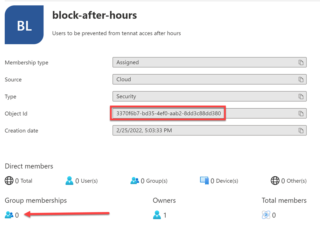 The first step in this process is to create a new Azure AD security group that will contain the users who will be prevented from accessing the tenant. You can also create this security group in the Microsoft 365 portal but it is better to do it in Azure as you’ll need to get the ObjectID for this group as highlighted above. There is also no need to actually put any users into this group as they’ll be added dynamically by Power Automate.