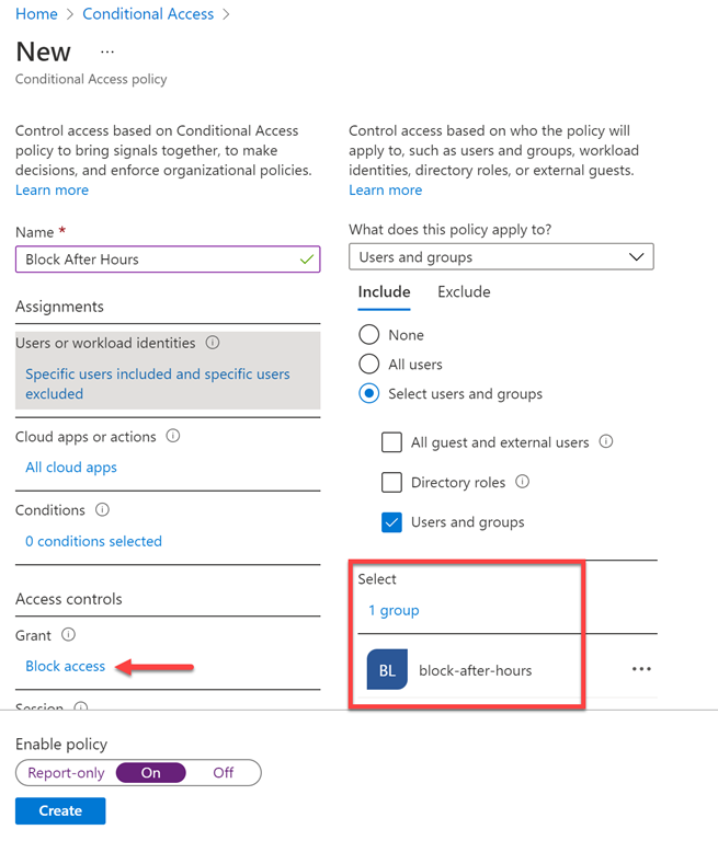 Give this new Conditional Access policy a name and set it to include just the Azure AD security group created previously. It is also best practice to exclude at least one administration account to prevent you from being ‘locked out’ of your tenant. Ensure that All cloud apps is selected and that Block access is configured, as shown above. Finally, turn this Conditional Access policy On.