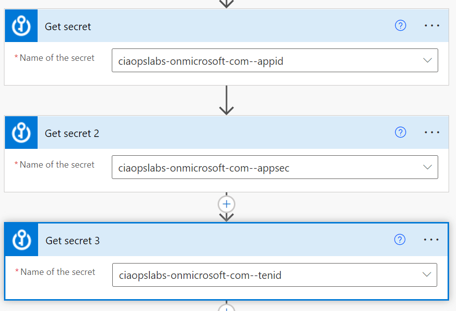The security parameters come from the Azure Key Vault Get secret actions.
