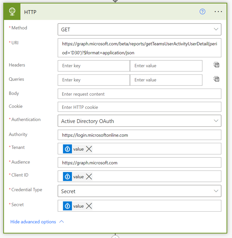 You’ll need to trigger your Flow the way that suits you. Typically you’d schedule it to run on the first of each month. You’ll then need to use the Get secret action from the Azure Key Vault as shown above. You should also note that this is a premium connectors, so you’ll need an appropriate Power Platform license to use this.