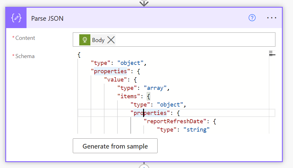 The data returned from this HTTP action will be in JSON format, so that is fed into the Parse JSON action as shown above.