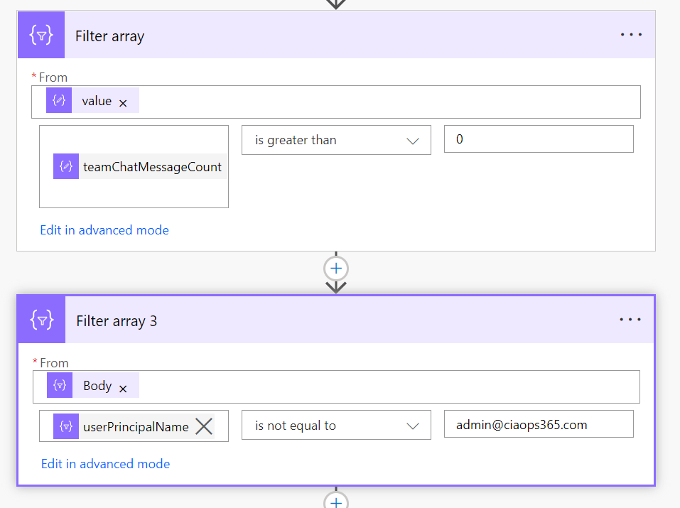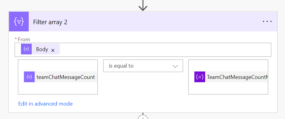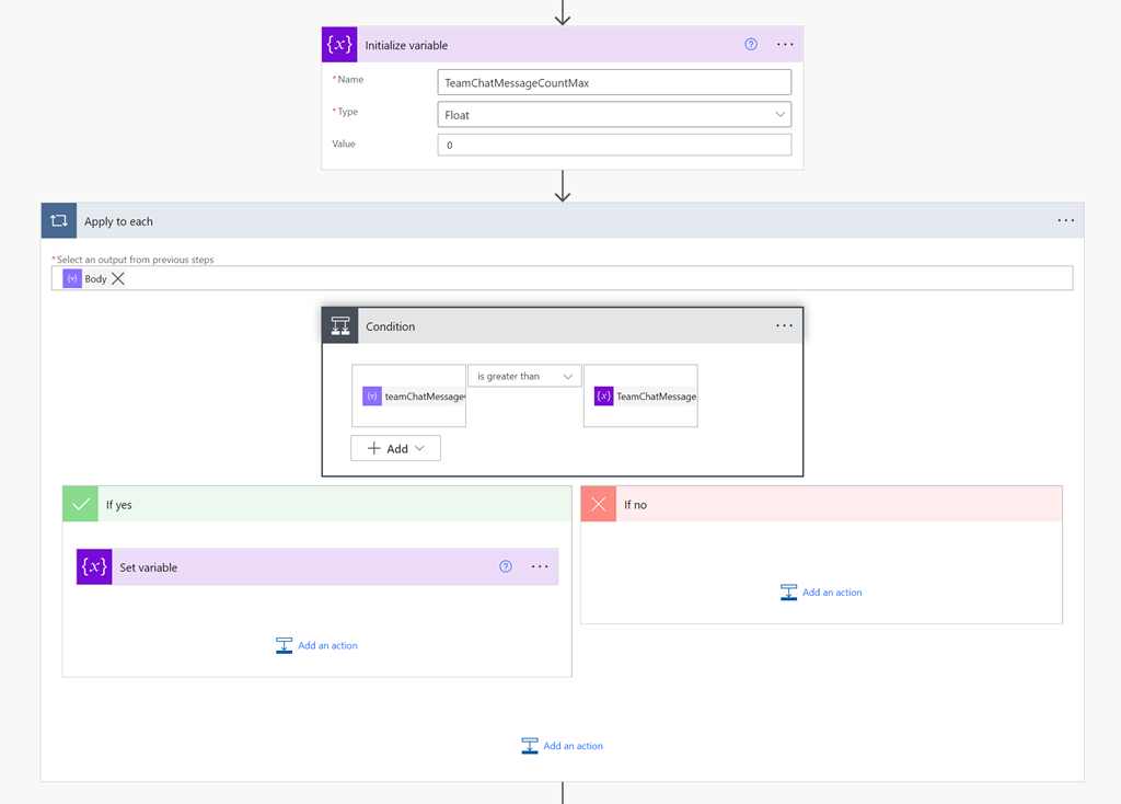 One of the limitations I found during this development process was that Flows are not very good at sorting information. It would have been nice if I could have just sorted my results from largest to smallest. I solved this but firstly creating a temporary variable into which I would store the highest number of chat messages. I then looped through all the remaining results using the Apply to Each action shown above, and set this variable to the greatest value found throughout the results.