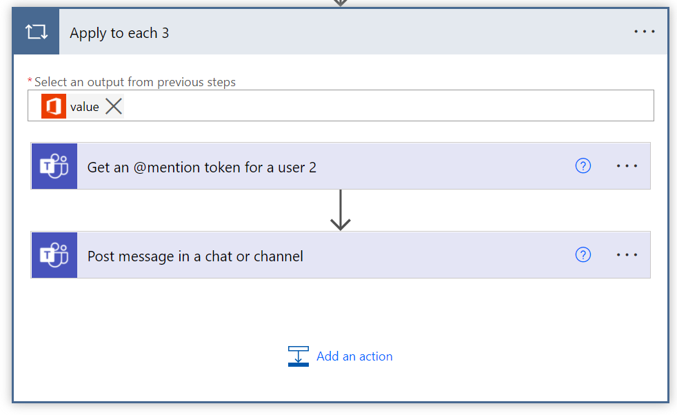 Now that I have the user information I can use it with the Get an @mention token for a user action and then post a message with that @mention and anything else into the Team to publicly recognise the user(s) using the Post message in a chat or channel action.