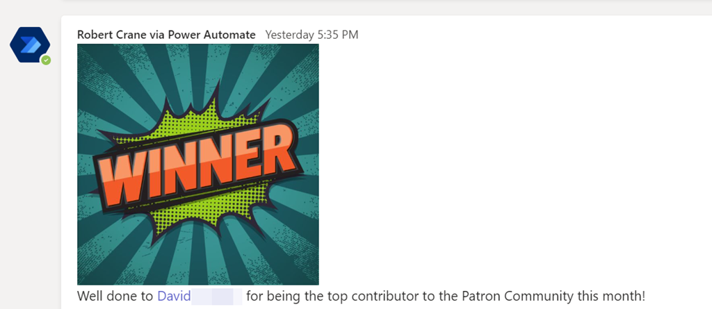 The end result is a nice message, like shown above, that acknowledges the user(s) for their contribution in the Microsoft Team. Best part is that now it is automated it’ll do all the hard work for you going forward!