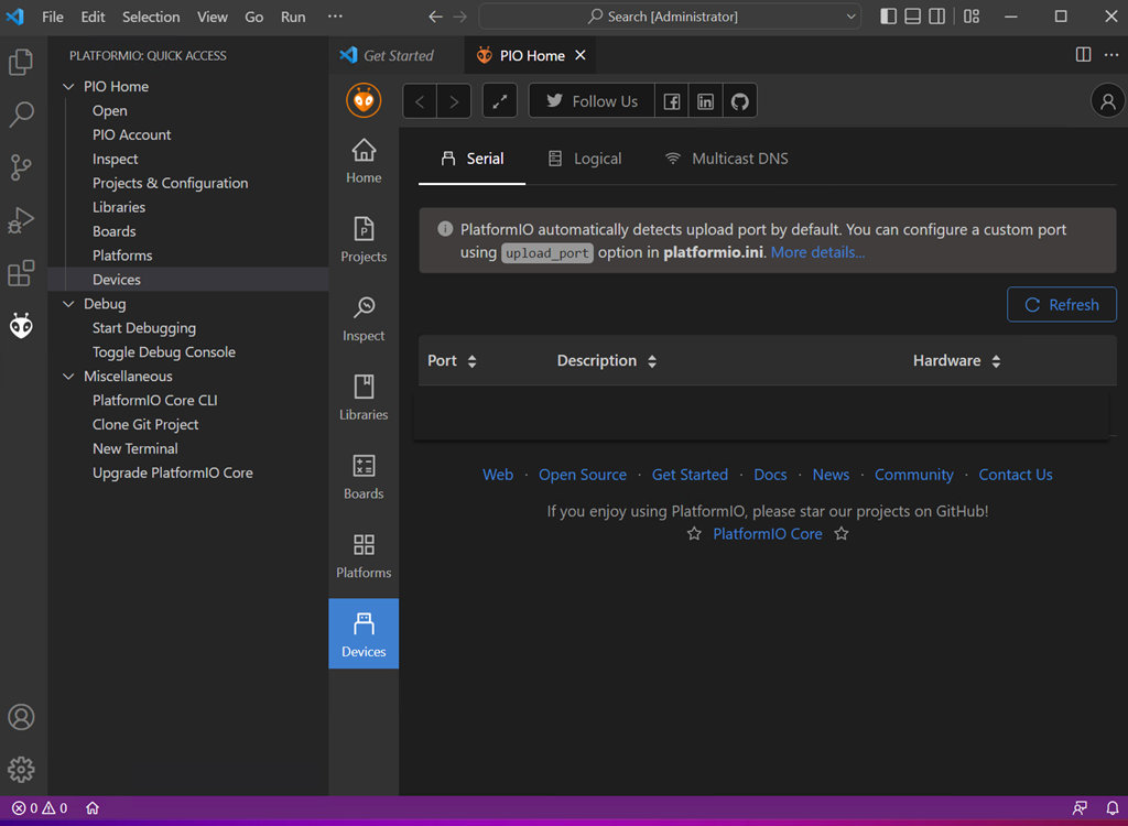 After more searching I discovered that PlatformIO wasn’t showing me any devices like so: