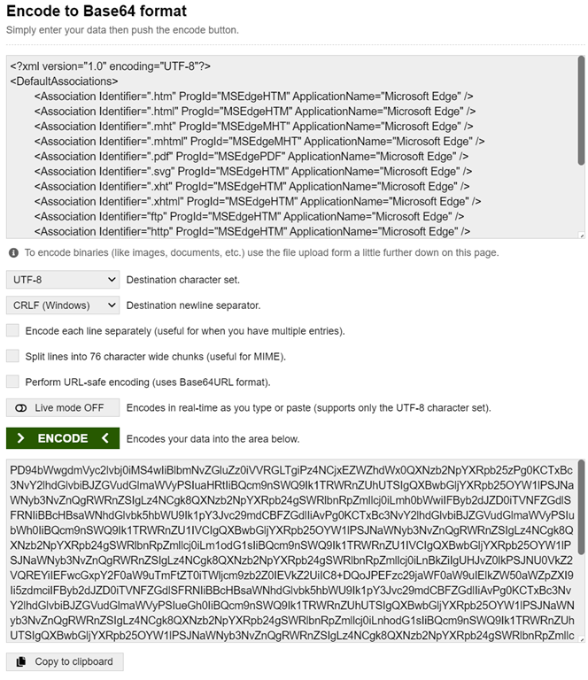 Next, you’ll need to convert that XML file to a base64 file for us an Intune policy. You can do that using the following site: