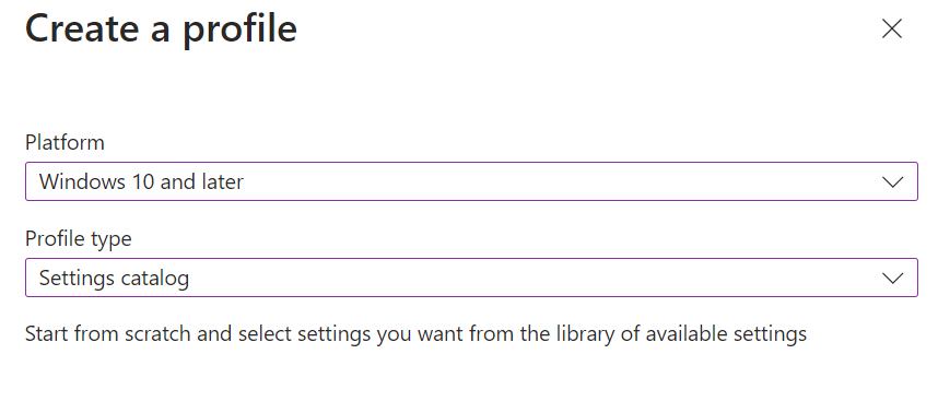 In the Intune console, create a new Device Configuration profile using the Settings Catalog: