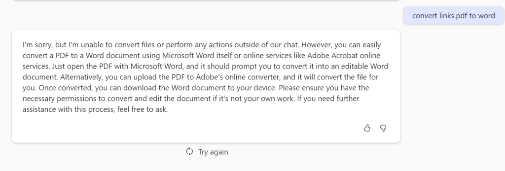 But if I ask it to convert this PDF to a Word document it again is not something that can be done here.