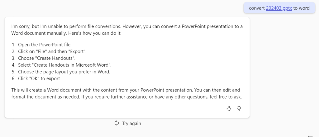 If I ask Copilot for Microsoft 365 to convert a PowerPoint document you’ll see I get a response that gives me a little more more information about what I should do.