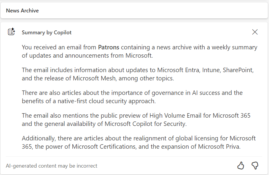 I’ve now had a chance to play with Copilot for Security and can recommend it but to ensure that costs don’t spiral out of control for SMB, it needs to used in an ad hoc manner. Listen along for my thoughts and a walk through of resources available for you. Also news of updates of Exchange email threshold limits being changed as well as improvements for Microsoft Mesh, Loop and more. Listen in for the latest updates.