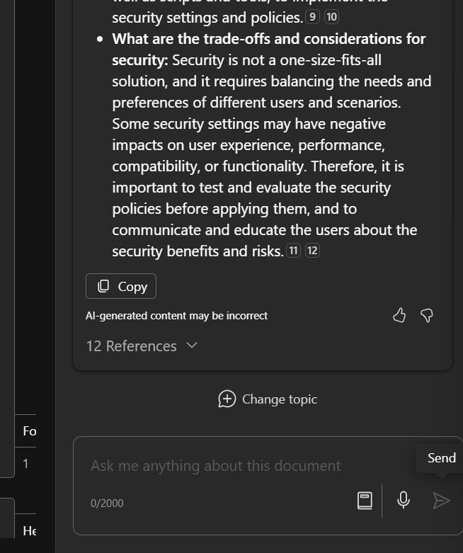 It is also important to remember that Copilot for Microsoft 365 responses are not immediate. They take a few moments to generate. That can be frustrating for people who are used to “immediate’ responses and are time challenged. Again, Copilot for Microsoft 365 is great research tool that you spend time with, it not a tool that you fire rapid questions at expecting an immediate response, just yet.