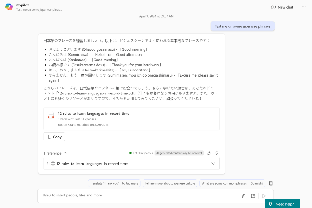 If prompt it with something generic like ‘Test me on some japanese phrases‘ you see the response it returns with above. If I expand the References you can see that Copilot for Microsoft 365 has returned material from the web (12-rules-to-learn-languages-in-record-time as well as referring a document that is in SharePoint. It is important to note that benefit this provides over other stand alone AI chat programs like ChatGPT that only return information from the web. Thus, the biggest different with Copilot for Microsoft 365 is that is works across the web and data in Microsoft 365.